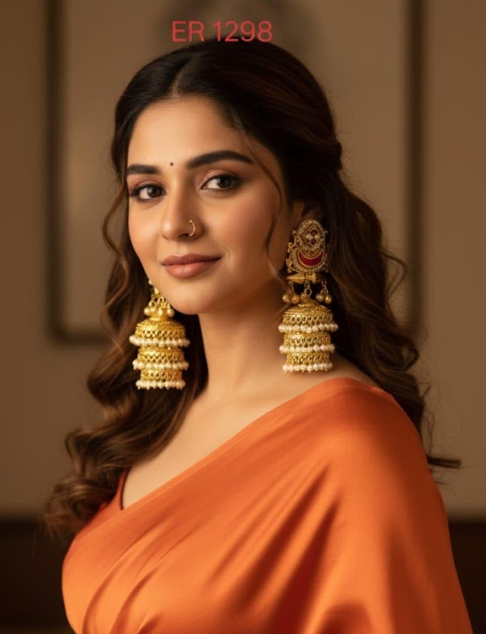 A luxurious multi-layered jhumka design featuring pearl clusters, intricate motifs, and a refined gold finish. Ideal for...